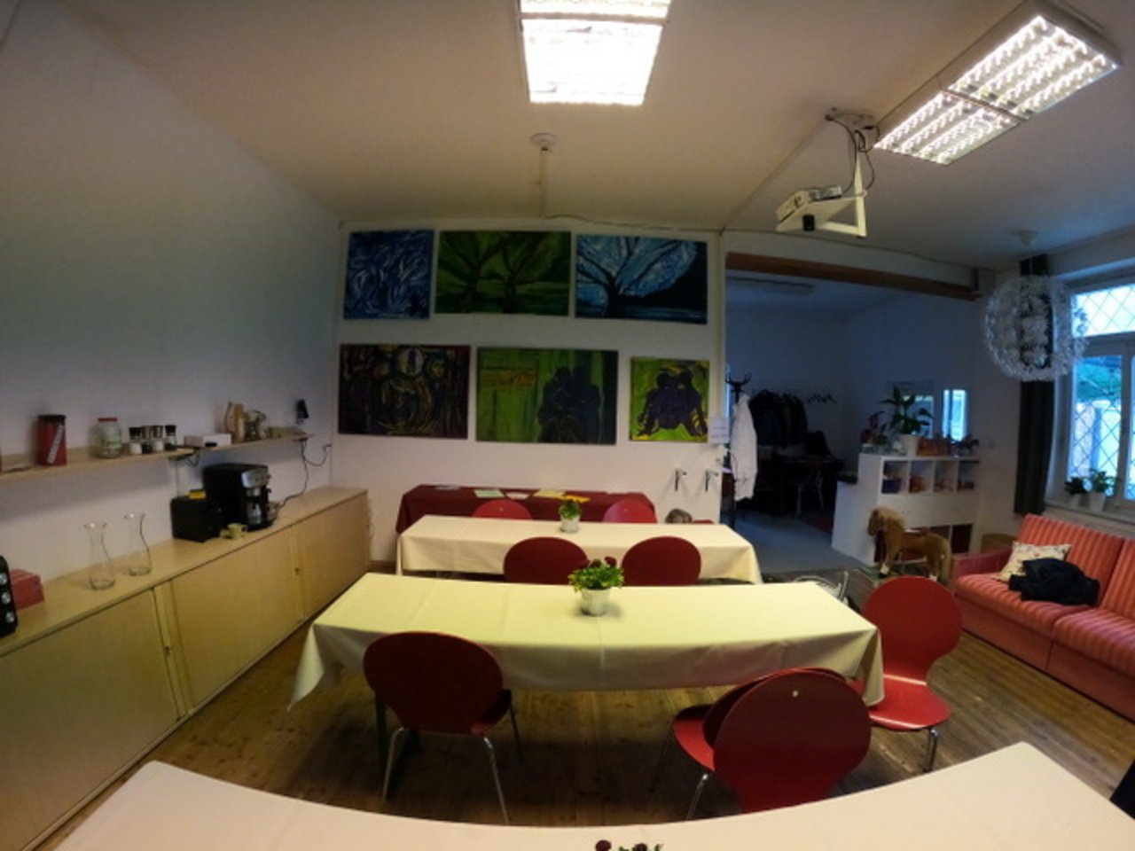 Der FreiRaum kann kostenlos genutzt werden und bietet Platz für ca. 35 Personen. Zur vorhandenen Infrastruktur gehören Tische, Stühle, eine kleine Küche mit Geschirrspüler und Kochgelegenheit, Kaffeemaschine, eine gemütliche Couch, Kühlschränke, ein Beamer, eine Spielecke für Kinder, Flipchart etc.